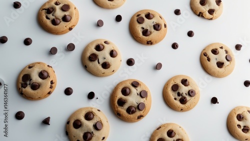 Aerial view of flying chocolate chip cookies on a background, featuring a text placeholder
