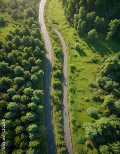 Aerial view of green countryside with forest and road, hidden treasure, travel destination