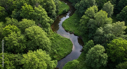 Aerial View of Green Forest with Curving River in Natural Wilderness Scene