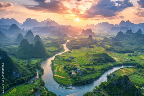 Aerial View of Guilin's Green Mountains, Rivers, and Countryside with Colorful Clouds