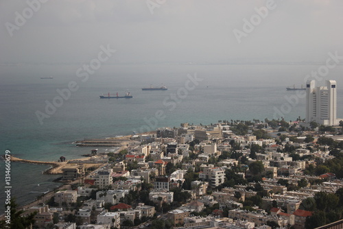 Aerial view of Haifa, Israel, along the Mediterranean coast. Urban cityscape by the sea.