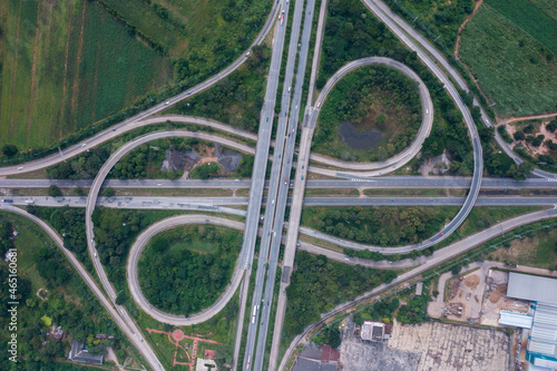 Aerial view of highway junctions with roundabout. Bridge roads shape circle in structure of architecture and transportation concept. Top view. Urban city, Bangkok at sunset, Thailand