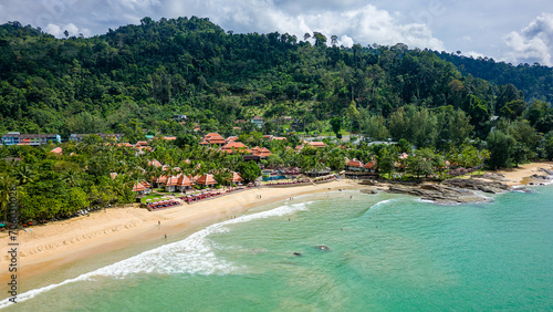 Aerial view of hotels and resorts next to the tropical Nangthong Beach in Khao Lak, Thailand