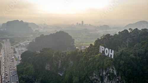 Aerial view of 'IPOH' landmark on a limestone mountain in Ipoh city, Malaysia.