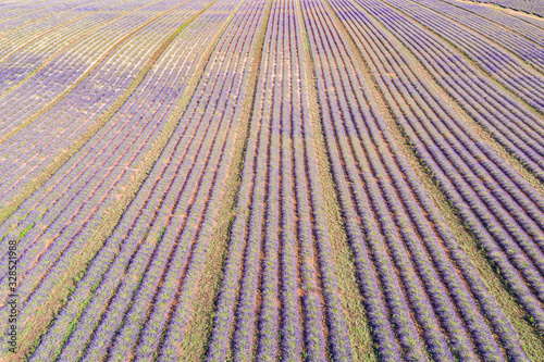Aerial view of lavender field. Aerial landscape of agricultural fields, amazing birds eye view from drone, blooming lavender flowers in line, rows. Agriculture summer season banner