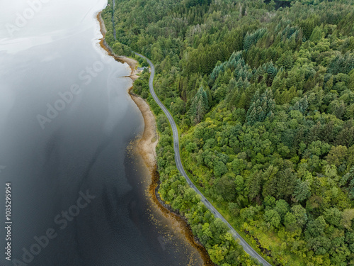 Aerial view of Loch Leven with a winding road surrounded by lush forest and beautiful scenery, Ballachulish, United Kingdom.