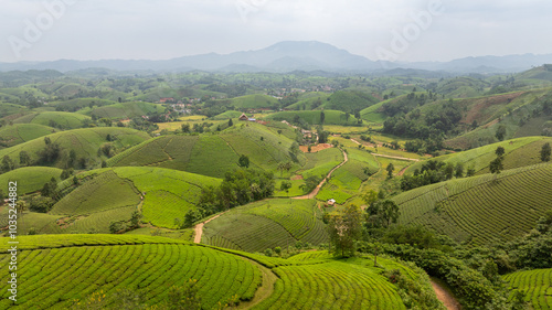 Aerial view of Long Coc tea hills, Phu Tho province, Vietnam. Beautiful green tea plantation in Vietnam. Nature background.