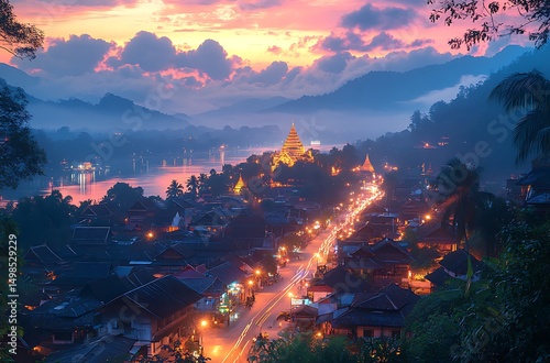 Aerial view of luang prabang laos at sunset with illuminated temples and lights