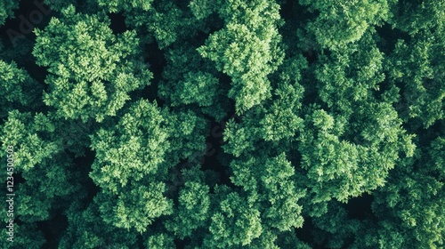 Aerial view of lush green forest canopy; nature background