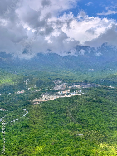 Aerial view of lush green landscapes and mountains near Tivat, Montenegro under cloudy skies