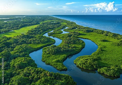 Aerial View of Lush Green Mangrove Forests and Winding Rivers Meeting the Tranquil Ocean in a Serene Coastal Landscape Under a Blue Sky