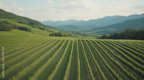 Aerial View of Lush Green Vineyard on Hillside with Distant Mountains