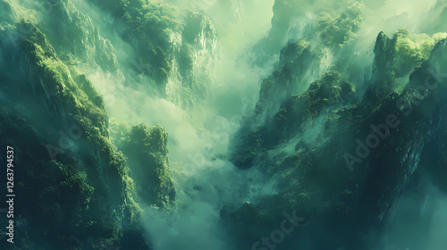 Aerial view of lush vertical landscapes in misty mountains nature photography emerald shades vibrant atmosphere gigapixel detail. Emerald Mist Valleys. Illustration