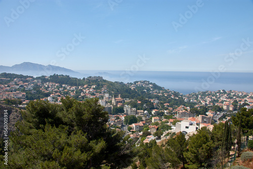 Aerial view of Marseille from the Notre Dame de la Garde observation deck with morning fog partially covering the city and skyline