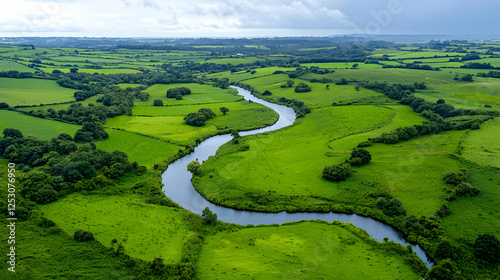 Aerial view of meandering river through green fields