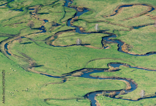 Aerial view of meandering river through lush green wetlands with scenic grassland and trees, Bashkortostan Republic, Russia.