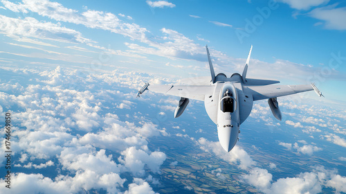 Aerial view of military jet soaring above fluffy clouds, showcasing advanced technology and power in flight