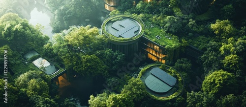 Aerial View of Modern Eco-Friendly Buildings with Green Roofs Surrounded by Lush Forest in a Sustainable Urban Environment