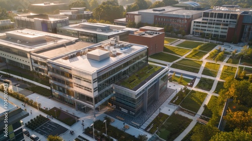 Aerial View of Modern Office Building with Green Roof and Surrounding Landscape