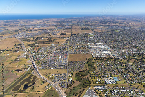 Aerial view of Mount Duneed residential area along the ocean coastline, Victoria, Australia.