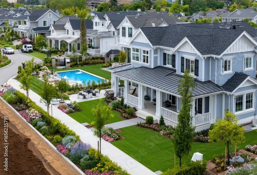 Aerial view of new suburban homes in the mid-west, houses on the left side and right side with some home gyms, swimming pools