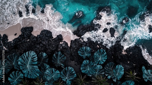 Aerial view of ocean waves crashing on volcanic rocks, lush tropical leaves