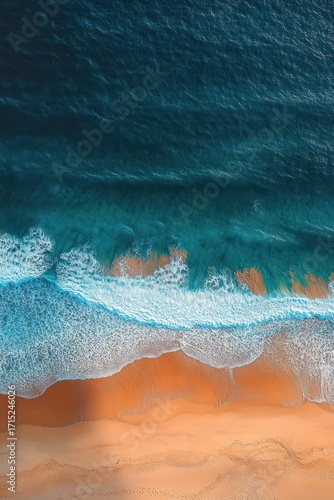 Aerial view of ocean waves gently crashing onto a golden sandy beach with visible water textures and shore foam