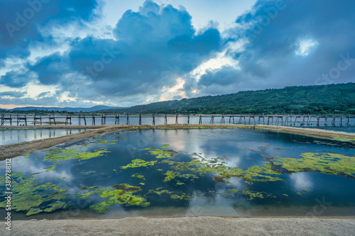 Aerial view of Ong Cop or Mr Tiger wooden bridge at Phu Yen, Vietnam. This is the longest wooden bridge in Vietnam