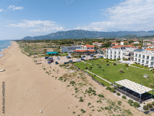 Aerial view of Paralia Kakovatos beach on the Peloponnese peninsula in Greece