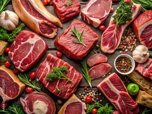 Aerial View of Raw Pork & Beef Cuts - Gourmet Meat Selection