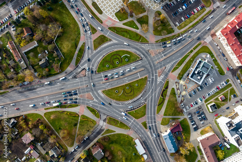 aerial view of road interchange or highway intersection. Junction network of transportation taken by drone.