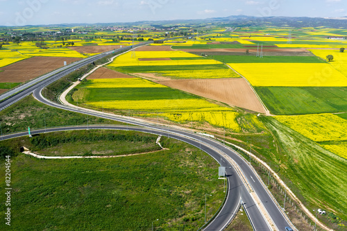 Aerial view of road passing through a rural landscape with bloom