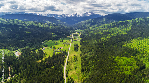 Aerial view of road to Hoverla, Ukraine Carpathian mountains.
