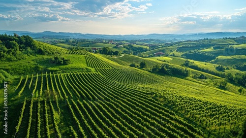 Aerial View of Rolling Hills Covered in Vibrant Green Vineyards on a Sunny Day