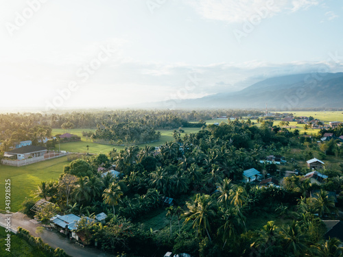 Aerial view of rural with ricefield and coconut trees in Aceh, Indonesia.