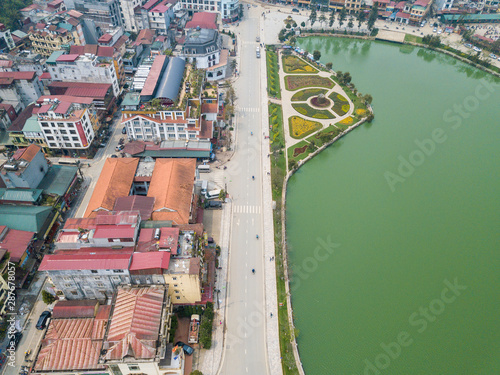 Aerial view of Sapa cityscape with Sapa lake an iconic emerald green lake in the downtown of Sapa the capital city in Lao Cai province in north-west of Vietnam.