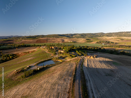 Aerial view of scenic rolling hills and vineyards at sunset, San Quirico d'Orcia, Italy.
