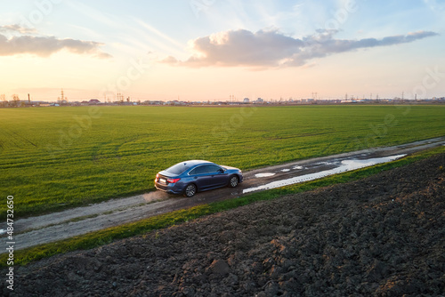 Aerial view of sedan car driving fast on dirt road at sunset. Traveling by vehicle concept
