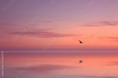 aerial view of serene ocean surface at sunset featuring solitary seagull gliding gracefully