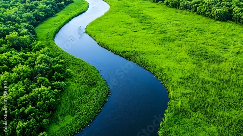 Aerial View of Serpentine River Winding Through Lush Green Landscape