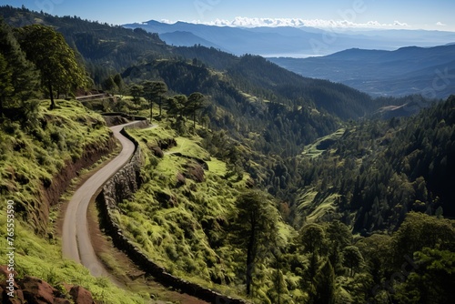 Aerial view of serpentine road winding through verdant summer mountains, scenic top down perspective