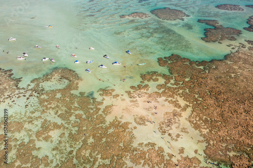 Aerial view of several boats and people walking on the shallow waters of Antunes natural pools in Maragogi. Alagoas, Brazil.
