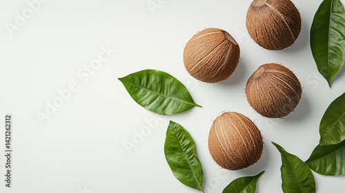 Aerial view of several coconuts with green leaves scattered on a white background in a studio setting