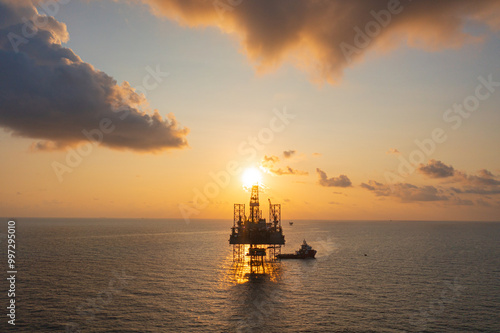 Aerial view of silhouette offshore jack up drilling rig during sunset - oil and gas industry.
