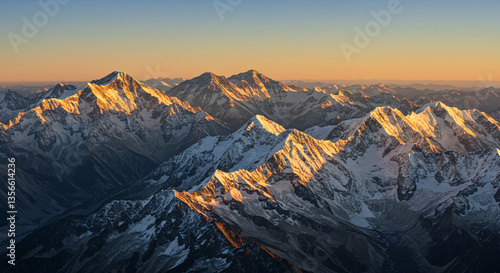 Aerial View of Snow Capped Mountains Illuminated by Golden Sunlight at Sunrise or Sunset