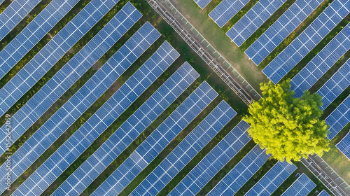 Aerial view of solar panels in a large solar farm with sunlight reflections and green trees in the background