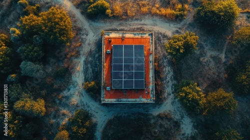 Aerial view of solar panels on rooftop amidst lush forest landscape