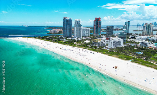 Aerial view of South Pointe Park. Miami Beach. Florida. USA. Weekend in Miami Beach. Aerial panoramic view of the city of Miami, buildings, marina, yachts and luxurious apartments.