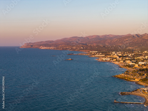 Aerial view of Stalida, Crete, showing the Aegean Sea, rugged coastline, small beaches, and town buildings with hills and mountains at sunset.