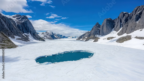 Aerial view of stunning icy landscape featuring glacial lake surrounded by towering mountains